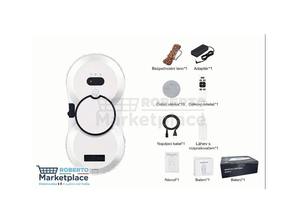 • Dálkový ovladač • Bezpečnostní lano • Napájecí adaptér a kabel • Rozprašovací nádobka • Mikrovláknové čisticí podložky • Návod k použití |