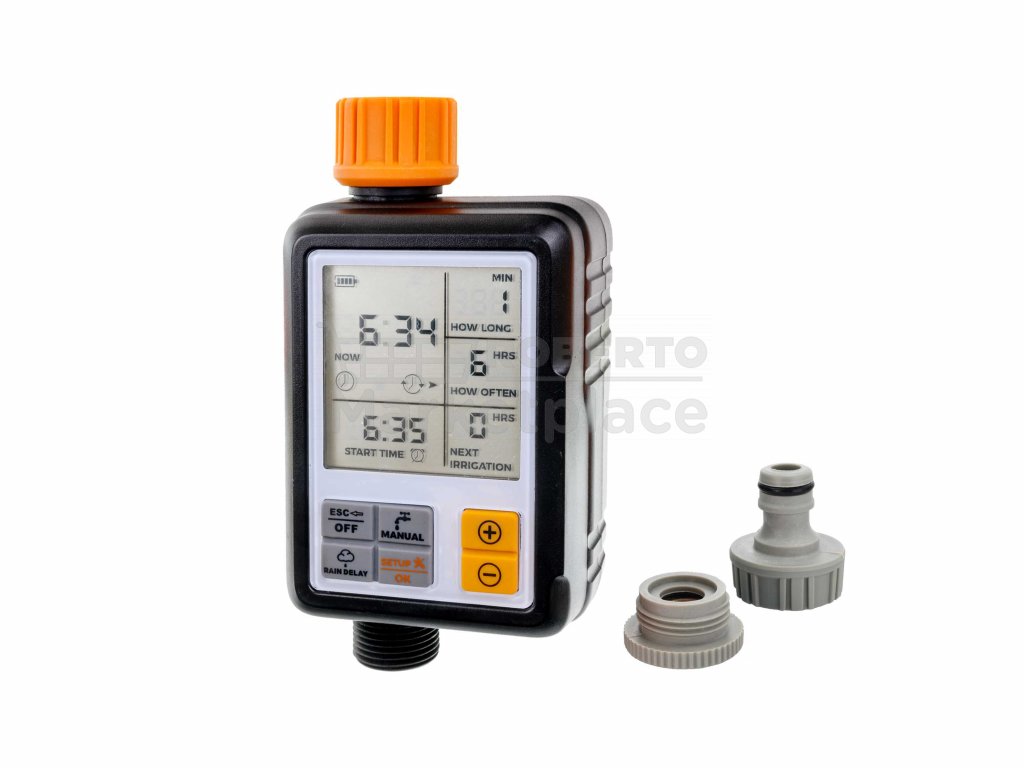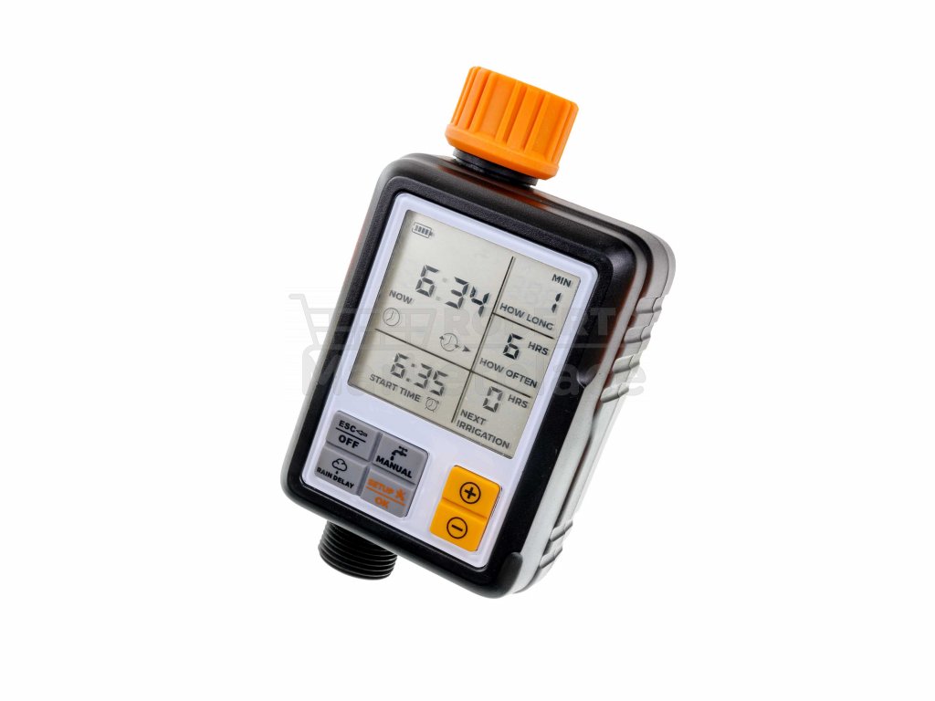 Tato Závlahový digitální počítač umožňuje přímé propojení přívodu vody a napojení zahradní hadiceká. Představuje skvělé automatizované řešení pro zavlažování zahrad, sadů, vinice, skleníků, rostlin a stromů. Flexibilní naprogramování umožní dávkovat vodu přesně tehdy, kdy to potřebujete. Přístroj obsahuje časovač, hodiny, nastavitelnou časovou délku závlahy. A umožňuje i chytré funkce jako je manuální otevření průtoku, nebo tlačítko pro deštivé dny. Odolné tělo a velkým diplejem.