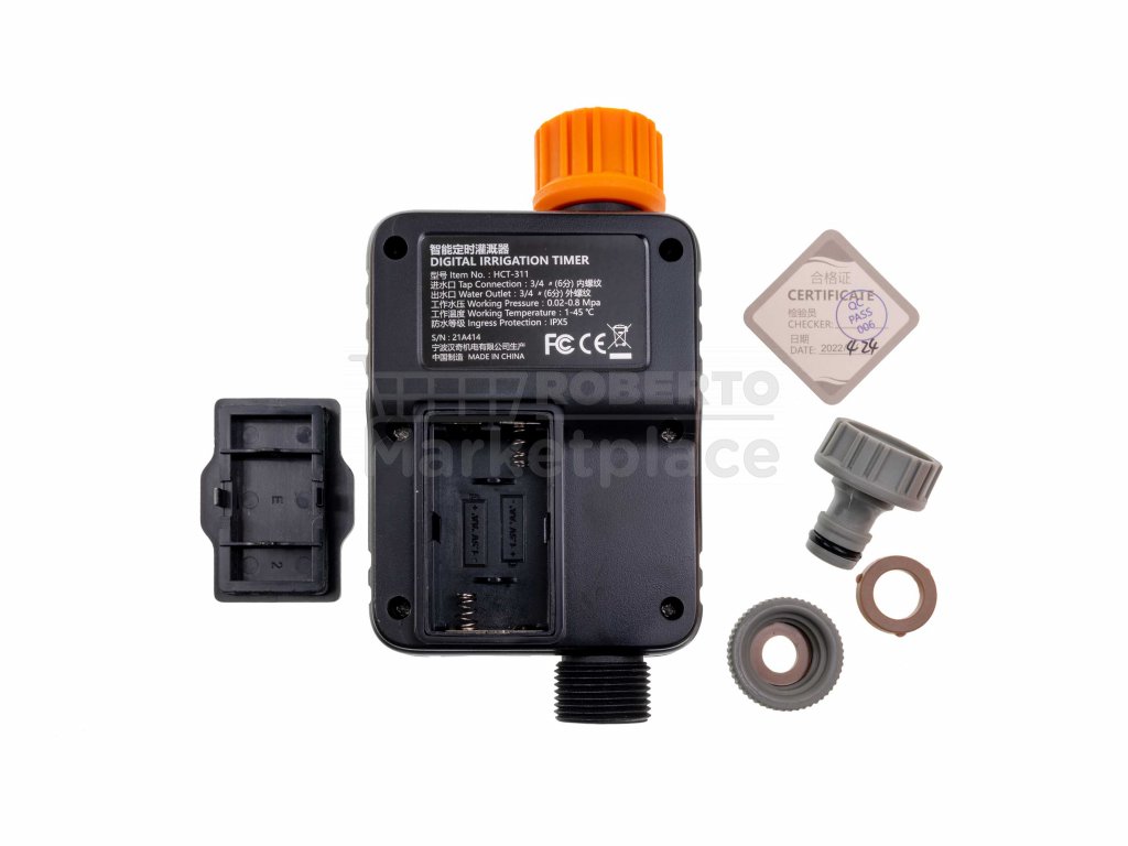 Obsahuje: 1x závlahový digitální počítač, 2x baterie AA, koncovky s těsněním a flitrem pro napojení vstupu/výstupu vody.